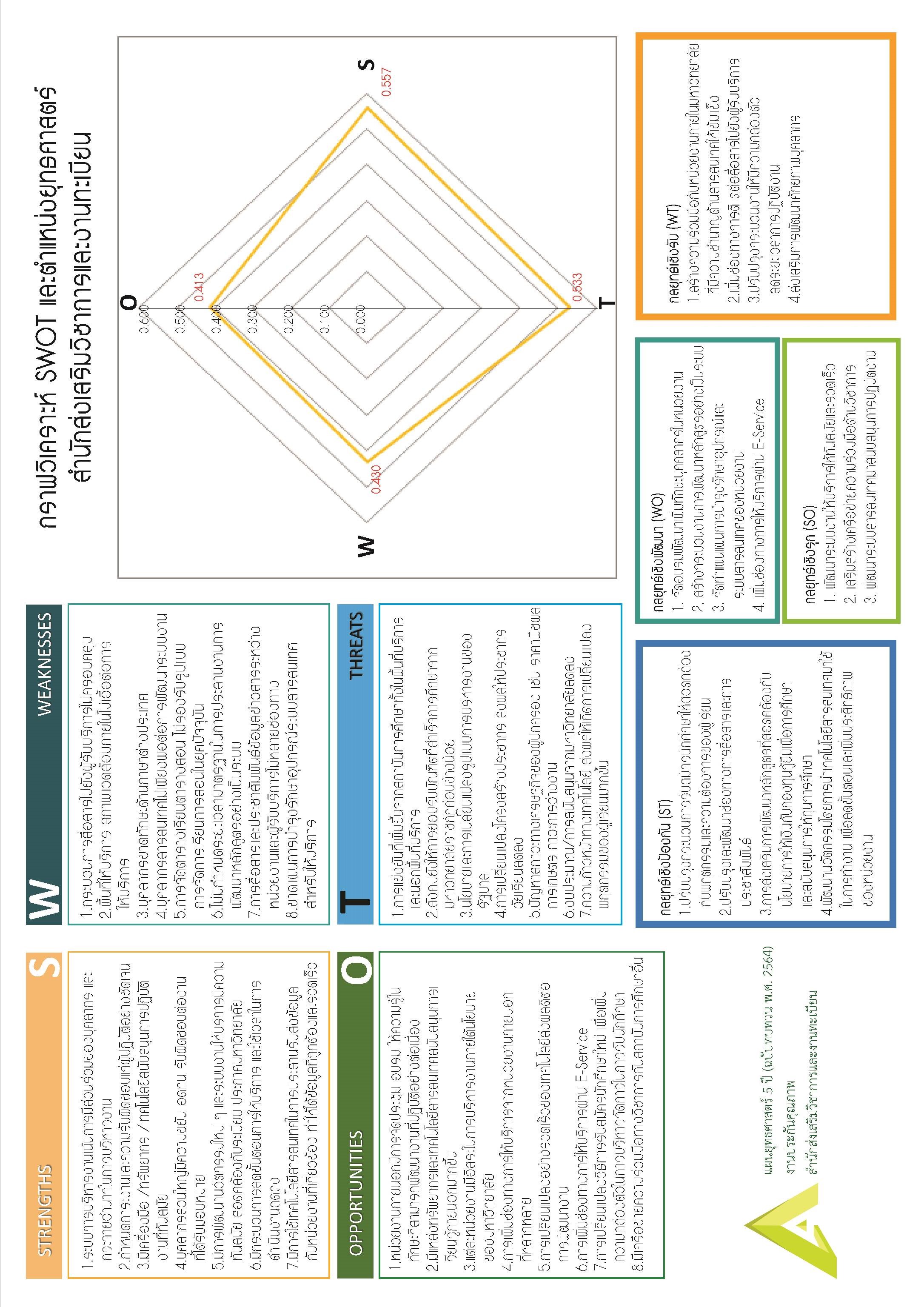 ผลการดำเนินงาน ในปีงบประมาณ 2565 สำนักส่งเสริมวิชาการและงานทะเบียน มีการทบทวนแผนกลยุทธ์ระดับต่าง ๆ ดังนี้ 1. แต่งตั้งคณะกรรมการ ทบทวนแผนยุทธศาสตร์ และแผนปฏิบัติการประจำปี สำนักส่งเสริมวิชาการและงานทะเบียน เพื่อกำหนดนโยบาย แนวทางการดำเนินงานในการทบทวนแผนกลยุทธ์ต่าง ๆ 2. จัดประชุมคณะกรรมการบริหารสำนักฯ ร่วมกันคัดกรองผลการวิเคราะห์ข้อมูล สภาพแวดล้อมภายใน-ภายนอก (SWOT) จากบุคลากรที่ได้จากการประชุมกลุ่มย่อยเพื่อทบทวนแผนยุทธศาสตร์ฯ 5 ปี (2561-2565) ฉบับทบทวน ปี พ.ศ. 2564 และนำผลที่ได้มาจัดทำ TOWS Matrix (ภาพที่ 1) 3. วิเคราะห์ความเชื่อมโยงสอดคล้องระหว่างปรัชญา วิสัยทัศน์ พันธกิจระดับหน่วยงาน กับระดับมหาวิทยาลัย ซึ่งแผนยุทธศาสตร์ เป้าประสงค์ กลยุทธ์ ตัวชี้วัด และค่าเป้าหมาย มีความเชื่อมโยงไปยังแผนต่าง ๆ