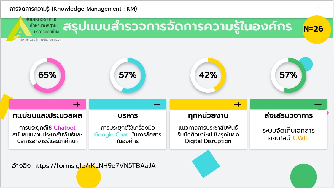 ผลการดำเนินงาน สำนักส่งเสริมวิชาการฯ มีการดำเนินการและบริหารจัดการความรู้ภายในหน่วยงาน ตามนโยบายการจัดการความรู้ของมหาวิทยาลัย และสนับสนุนการปฏิบัติงานตามภารกิจของสำนักฯ เพื่อพัฒนาหน่วยงานให้เกิดวัฒนธรรมแห่งการเรียนรู้อย่างเป็นระบบ ดังนี้ สำรวจความรู้ที่ต้องการ (P) 1. คณะกรรมการจัดการความรู้ ประกอบด้วยผู้บริหารและบุคลากร โดยพิจารณากิจกรรมการจัดการความรู้ในปีงบประมาณ 2564 มาใช้เป็นแนวทางกำหนดประเด็นความรู้ และกลุ่มเป้าหมายของการจัดการความรู้ ที่สนับสนุนการดำเนินงานพันธกิจของหน่วยงาน 2. คัดเลือกประเด็นความรู้ที่บุคลากรต้องการ ซึ่งประเด็นความรู้ที่บุคลากรส่วนใหญ่ให้ความสนใจ โดยดำเนินการสำรวจความรู้ที่ต้องการจากบุคลากรภายในหน่วยงาน เพื่อคัดเลือกความรู้ที่บุคลากรมีความสนใจ และต้องการเรียนรู้ร่วมกัน ผ่านช่องทาง https://forms.gle/rKLNH9e7VN5TBAaJA ผลการสำรวจ พบว่า ผู้บริหารและบุคลากร จำนวน 26 คน โหวตเลือกความรู้ที่ต้องการแลกเปลี่ยน ใน 4 เรื่อง ผลดังนี้