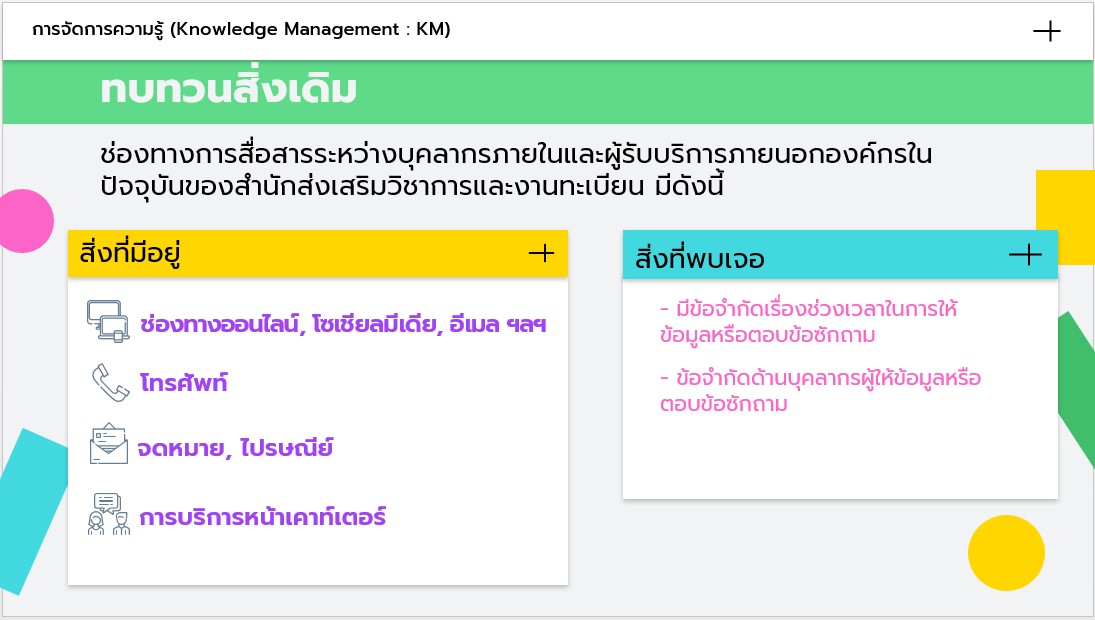 ประเด็นความรู้: สื่อสารในยุคดิจิทัลเพื่อยกระดับงานบริการของหน่วยงาน ขอบเขตความรู้: สอดคล้องกับประเด็นยุทธศาสตร์ที่ 3 ส่งเสริมการบริหารจัดการที่ได้มาตรฐานและเป็นไปตามหลักเกณฑ์และวิธีการบริหารกิจการบ้านเมืองที่ดี เป้าหมายของการจัดการความรู้: เพื่อให้บุคลากรภายในหน่วยงานได้แลกเปลี่ยนเรียนรู้และสามารถนำแนวคิด แนวปฏิบัติที่ดีในการสื่อสารภายในองค์กร และการสื่อสารระหว่างองค์กร กับบุคคล ภายนอก ตลอดจนเครื่องมือสนับสนุนการสื่อสารข้อมูลด้านวิชาการที่มีประสิทธิภาพ ไปใช้ในการพัฒนาหน่วยงานอย่างมีประสิทธิผล กลุ่มเป้าหมาย: ผู้บริหาร และบุคลากรภายในสำนักส่งเสริมวิชาการและงานทะเบียน การดำเนินกิจกรรม (D) 1. รวบรวมและสรุปผลการดำเนินงาน ปัญหา อุปสรรคในการปฏิบัติงานรอบปีงบประมาณที่ผ่านมา รวมทั้งแนวคิด เทคนิค วิธีการที่เกี่ยวข้องกับการปฏิบัติงานด้านต่าง ๆ ภายใต้กรอบงานตามโครงสร้างของสำนักฯ เช่น บริการหน้าเคาน์เตอร์ การตอบข้อซักถาม การประสานงานเรื่องต่าง ๆ และประเด็นปัญหา การดำเนินงานรอบที่ผ่านมา จากประเด็นความรู้ที่ต้องการคือ “สื่อสารในยุคดิจิทัลเพื่อยกระดับงานบริการของหน่วยงาน” พบว่า งานให้บริการของหน่วยงานจำเป็นต้องให้ความสำคัญเรื่องการดำเนินงานต้องเป็นไปตามระเบียบ ข้อบังคับ แล้วนั้น อีกสิ่งที่ต้องให้ความสำคัญไม่ต่างกันคือเรื่องการสื่อสารระหว่างผู้ให้บริการและผู้รับบริการ บุคลากรและผู้บริหารได้นำประเด็นดังกล่าวมาทบทวนความรู้เดิมและเครื่องมือที่มีอยู่เดิม ที่เกี่ยวข้องกับการสื่อสารระหว่างบุคคล ทั้งในแบบทางการและไม่เป็นทางการ 2. จัดกลุ่มของปัญหาที่พบจากการดำเนินงานที่ผ่านมา พร้อมทั้งแนวทางการจัดการปัญหา และความรู้ใหม่ที่ได้จากการแลกเปลี่ยนระหว่างบุคลากร นำข้อมูลความรู้ที่ได้จากการแลกเปลี่ยนเรียนรู้มาสรุปปัญหา และอุปสรรคจากการปฏิบัติงานของตนเอง ซึ่งสามารถแบ่งออกเป็นปัญหาและอุปสรรคที่พบเป็นรายด้าน ดังนี้ 2.1 ปัญหาหรืออุปสรรคที่เกิดจากตัวผู้ปฏิบัติงานเอง เช่น ขาดการเตรียมพร้อมในการให้บริการ การศึกษาทำความเข้าใจถึงกระบวนการ ขั้นตอนการบริการ 2.2 ปัญหาหรืออุปสรรคที่เกิดจากสิ่งอำนวยความสะดวก ที่สนับสนุนการให้บริการ ระบบสนับสนุนการให้บริการกลุ่มต่าง ๆ รวมถึงช่วงเวลาในการให้ข้อมูลและตอบข้อซักถาม